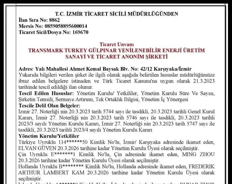 近日,BEVITOR·伟德国际集团股份有限公司的全资公司OME (Eurasia) Pte., Ltd.(以下简称“OME Eurasia”)与Sonsuz Enerji Holing B.V.(以下简称“Sonsuz”)已在伊兹密尔完成Transmark turkey Gulpinar Yenilenebilir Enerji Urtetim Sanayi(以下简称“TTG”)公司的股权变更手续,完成了OME Eurasia与Sonsuz此前签署的《TTG公司股权认购暨股东协议》所规定的交割程序。TTG新股东结构及董事会成员已在土耳其工商机构进行登报。至此OME Eurasia已成为拥有TTG49%股份的股东,Sonsuz控股51%。